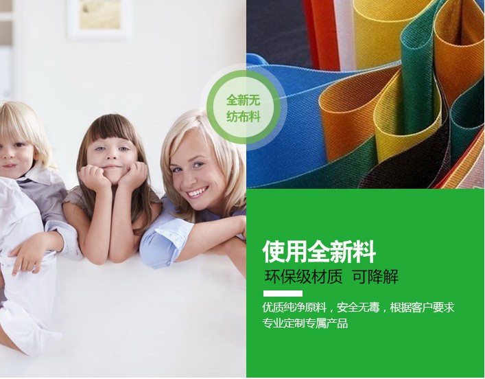 無紡布,又稱不織布,是新一代環(huán)保材料,具有拒水、透氣、柔韌、不助燃、無毒無刺激性、色彩豐富等特點。無紡布若置于室外經(jīng)自然分解,其最長壽命只有90天,置于室內(nèi)在5年內(nèi)分解,燃燒時無毒、無味、且無任何遺留物質(zhì),從而不污染環(huán)境,宜于洗滌。它直接利用高聚物切片、短纖維或長絲通過各種纖網(wǎng)成形方法和固結(jié)技術(shù)形成的具有柔軟、透氣和平面結(jié)構(gòu)的新型纖維制品。它具有塑料制品所不具有的環(huán)保性能,其被自然降解的時間遠(yuǎn)遠(yuǎn)低于塑料袋,因此,采用無紡布做成的無紡布袋也被公認(rèn)為最經(jīng)濟(jì)實惠的環(huán)保購物袋。